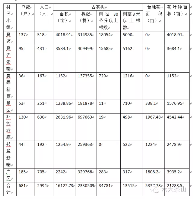 千百年來,人們似乎對賀開十分熟悉,卻又如此陌生。歷史仿佛為賀開留下一段遺憾。讓我們看一組吸引眼球的古茶樹統(tǒng)計數(shù)據(jù)吧:曼邁314985棵、曼弄老寨409499、曼弄新寨137355、曼囡181878棵、邦盆老寨697663棵、邦盆新寨259363棵、廣岡329766棵,合計2330509棵。